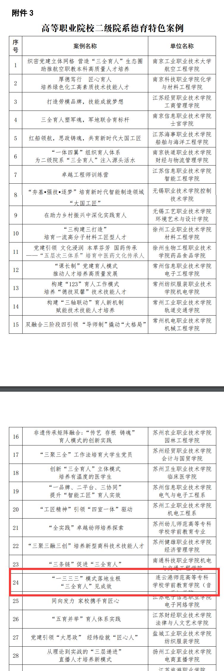 根据《省教育厅办公室关于加强职业院校“三全育人”典型学校培育建设的通知》(苏教办职函〔2022〕7号)要求,经各地各校申报、市级推荐和专家审核层层选拔,学前教育学院(音乐学院)报送的《“一三三三”模式落地生根 “三全育人”见成效》脱颖而出,入选省教育厅高等职业院校二级院系德育特色案例。