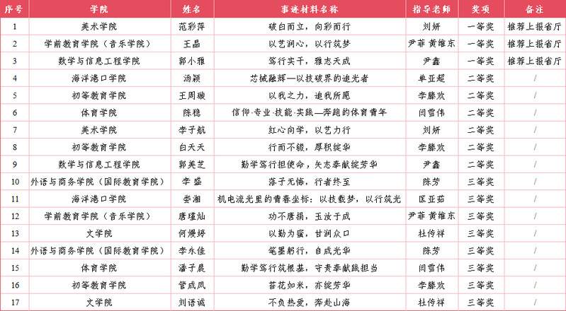 根据《省教育厅关于做好2025年普通高校国家奖学金国家励志奖学金有关工作的通知》(苏教助函〔20255号)要求,经个人申报、学院推荐、学校组织评议,我校2025年国家奖学金推荐学生事迹材料共评出一等奖3名、二等奖6名、三等奖8名,具体评比结果如下: