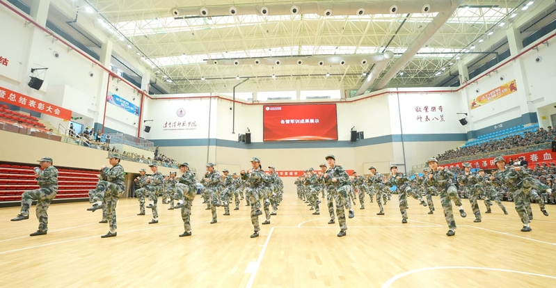 参训学生进行停止间转法、行进与立定训练科目和军体拳的展示。全体新生身着戎装,拉歌较量,合唱《强军战歌》,向祖国庄严、深情地告白,传递出新时代青年矢志在强国建设、民族复兴伟业中挺膺担当的坚定决心。