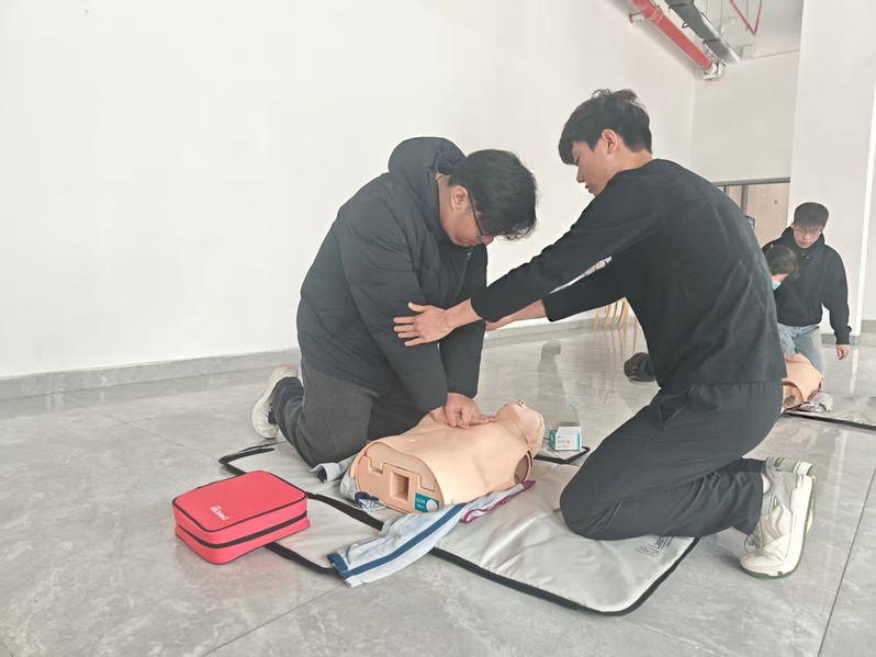 培训现场,李燕结合校园真实应急案例,用通俗易懂的语言拆解应急救护核心要点,系统讲解了心肺复苏(CPR)操作流程、自动体外除颤器(AED)工作原理、海姆立克急救法等技能的操作规范及注意事项。结合宿管员日常工作中可能遇到的学生突发晕倒、磕碰受伤等常见场景,李燕针对性地演示了创伤止血、包扎等实用急救技巧,确保培训内容贴合校园实际。在实操环节中,参训人员借助心肺复苏模拟人、AED训练机等专业教具,在主讲人的指导下分组练习、相互交流,认真熟悉每一个操作细节,现场学习氛围浓厚。“理论+实操”的培训形式,切实提升了参训人员的急救处置能力,为应对校园突发情况奠定了基础。